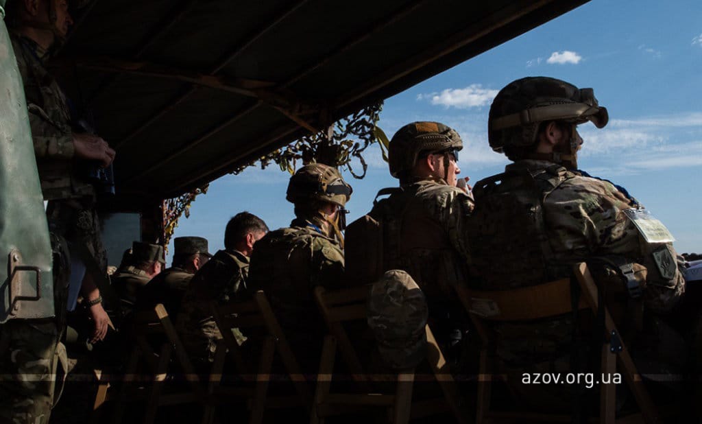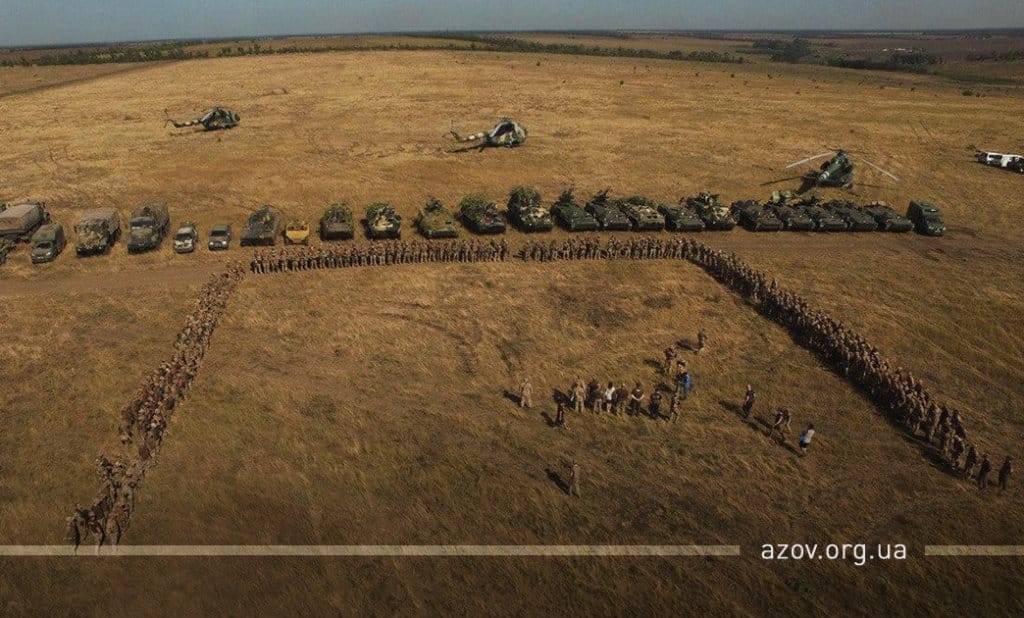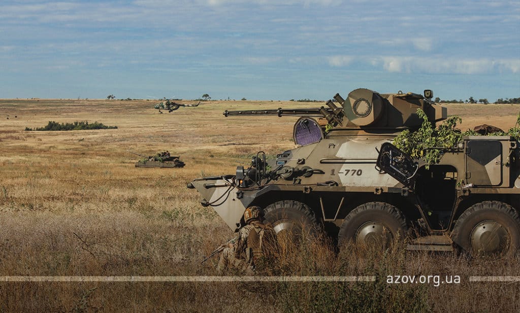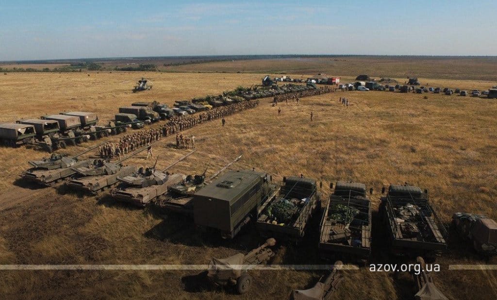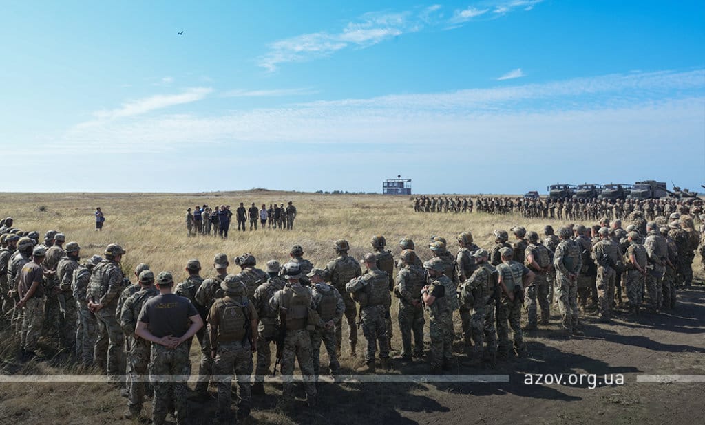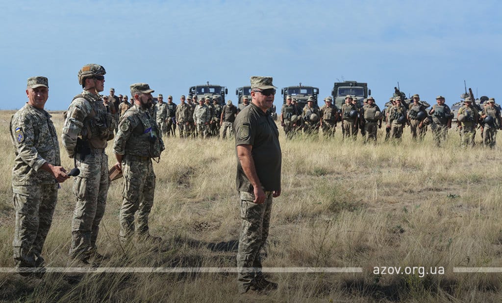 20 серпня на військовому полігоні «Урзуф» відбулися масштабні військові навчання з бойовою стрільбою за участі підрозділів Національної гвардії та Збройних сил України. Полк «Азов», особовий склад якого на час навчань був представлений у складі батальйонної тактичної групи «Азов», став основною одиницею загальновійськового резерву, залученою до навчань. БТГр «Азову» склали дві піхотні роти полку, танковий підрозділ, снайперська група, групи розвідки, інженерно-саперне відділення, мінометники, артилеристи, бійці зенітного ракетного підрозділу та інші сили. Вперше на навчаннях такого рівня була продемонстрована майстерність азовців у справі безпарашутного десантування, здійсненого з кабіни Мі-8, що на навчаннях представив військову авіацію спільно з екіпажами Су-25. Азовці продемонстрували професіоналізм надвисокого рівня та підтвердили готовність свого підрозділу якісно виконувати завдання за призначенням на передовій.