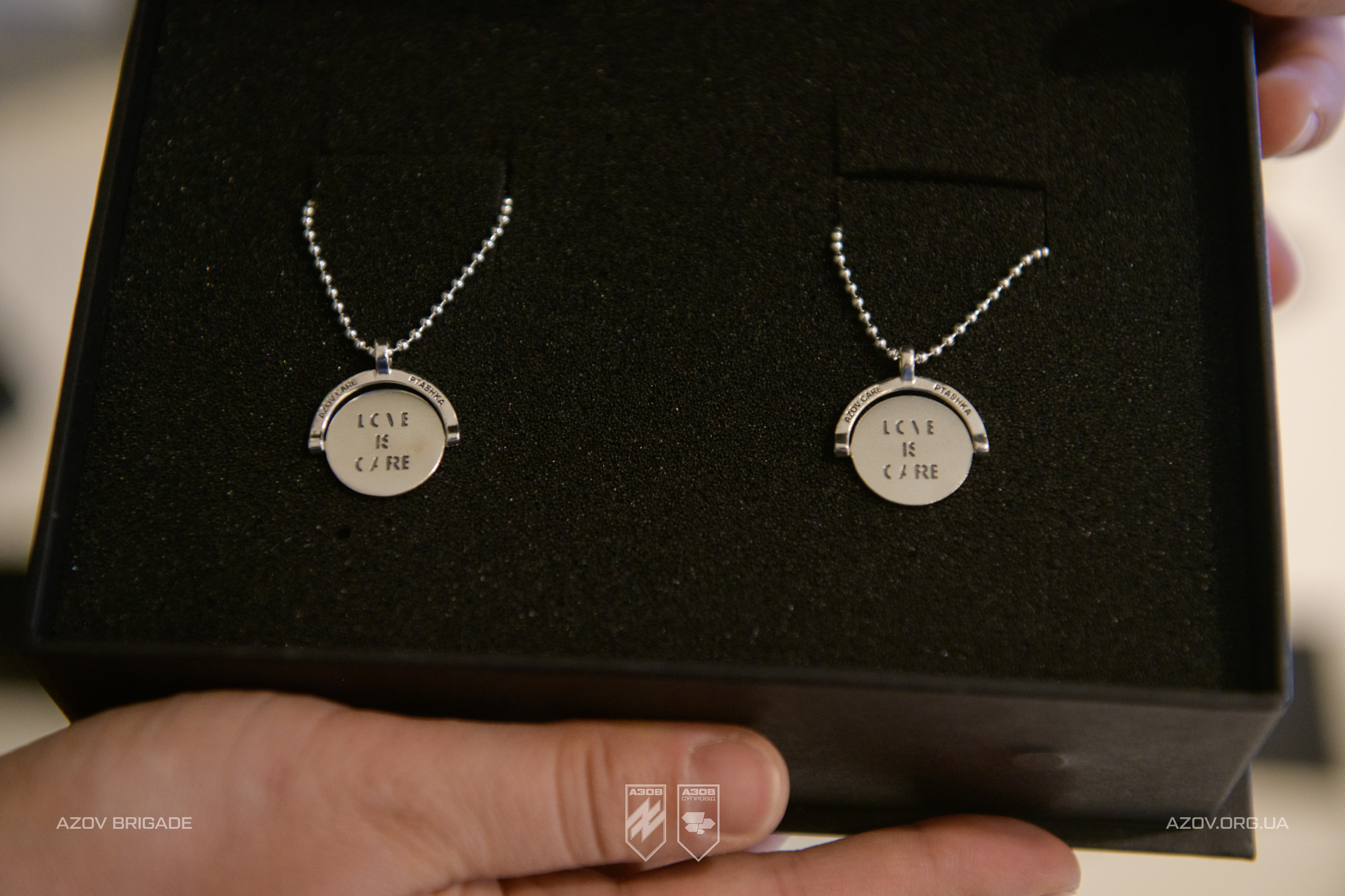 На знак вдячності за підтримку України герцогу та герцогині Сассекським вручили символічний подарунок від імені АЗОВ.Супровід – прикраси Love is care, що в перекладі: «Любов це турбота».